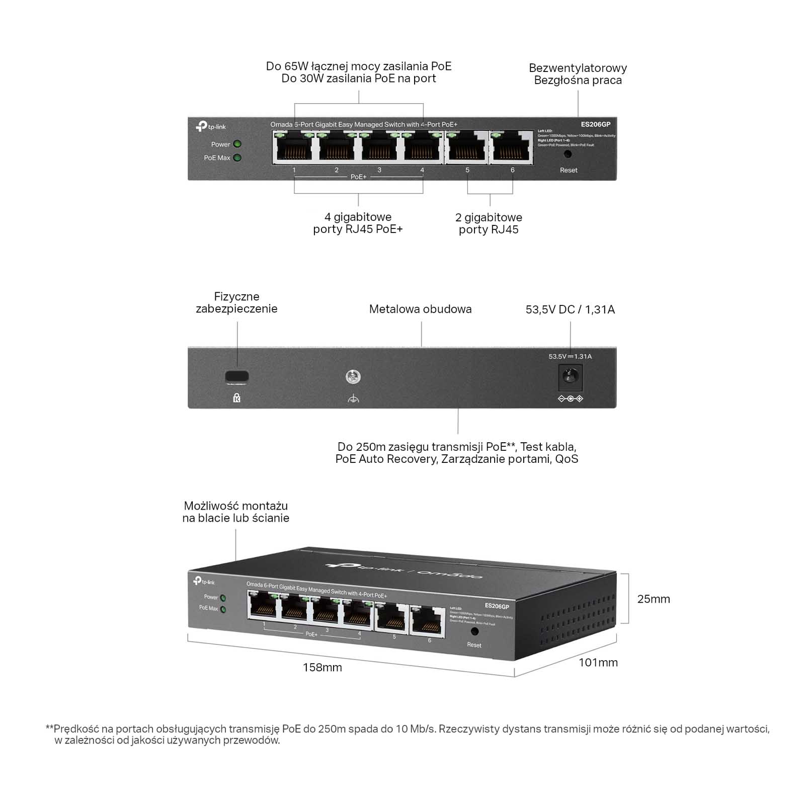 TP-Link ES206GP to zarządzalny przełącznik Omada Easy Managed, wyposażony w 6x portów Gigabit Ethernet 10/100/1000 Mb/s, w tym 4x porty PoE+ zgodne z 802.3at/af. Wszystkie porty obsługują automatyczną negocjację szybkości połączeń i automatyczne krosowanie Auto MDI/MDIX. Wydajnośc przełączania wynosi 12 Gb/s. Łączna moc zasilania wynosi do 65W, do 30W zasilania na każdym porcie PoE.