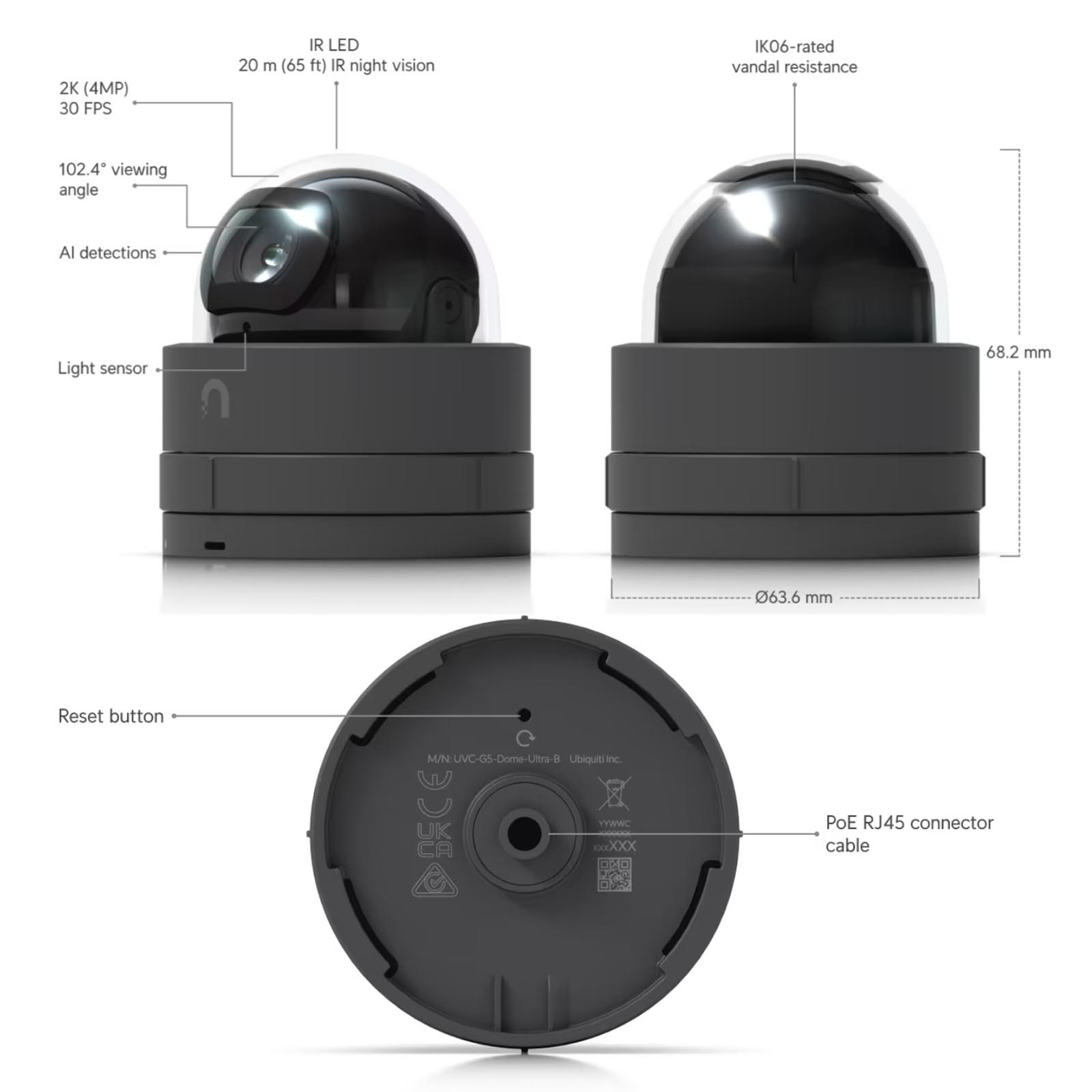 Ubiquiti UniFi Protect UVC-G5-Dome-Ultra to kamera piątej generacji z serii UniFi Video. Posiada matrycę CMOS 1/2,4" o rozdzielczości 4 MP (2688 x 1512 pikseli, 16:9) przy 30 klatkach na sekundę. Stały obiektyw ma kąt widzenia 102,4° w poziomie, 54,9° w pionie i 120,6° po przekątnej. Kamera jest wyposażona w 1x port Fast Ethernet 10/100 Mb/s, przez który jest zasilana za pomocą POE 802.3af lub pasywnego POE o napięciu wejściowym 37–57 V DC. Do pracy w trybie nocnym kamera jest wyposażona w oświetlacz IR o zasięgu 20 m. Maksymalny pobór mocy wynosi tylko 4,2 W.
