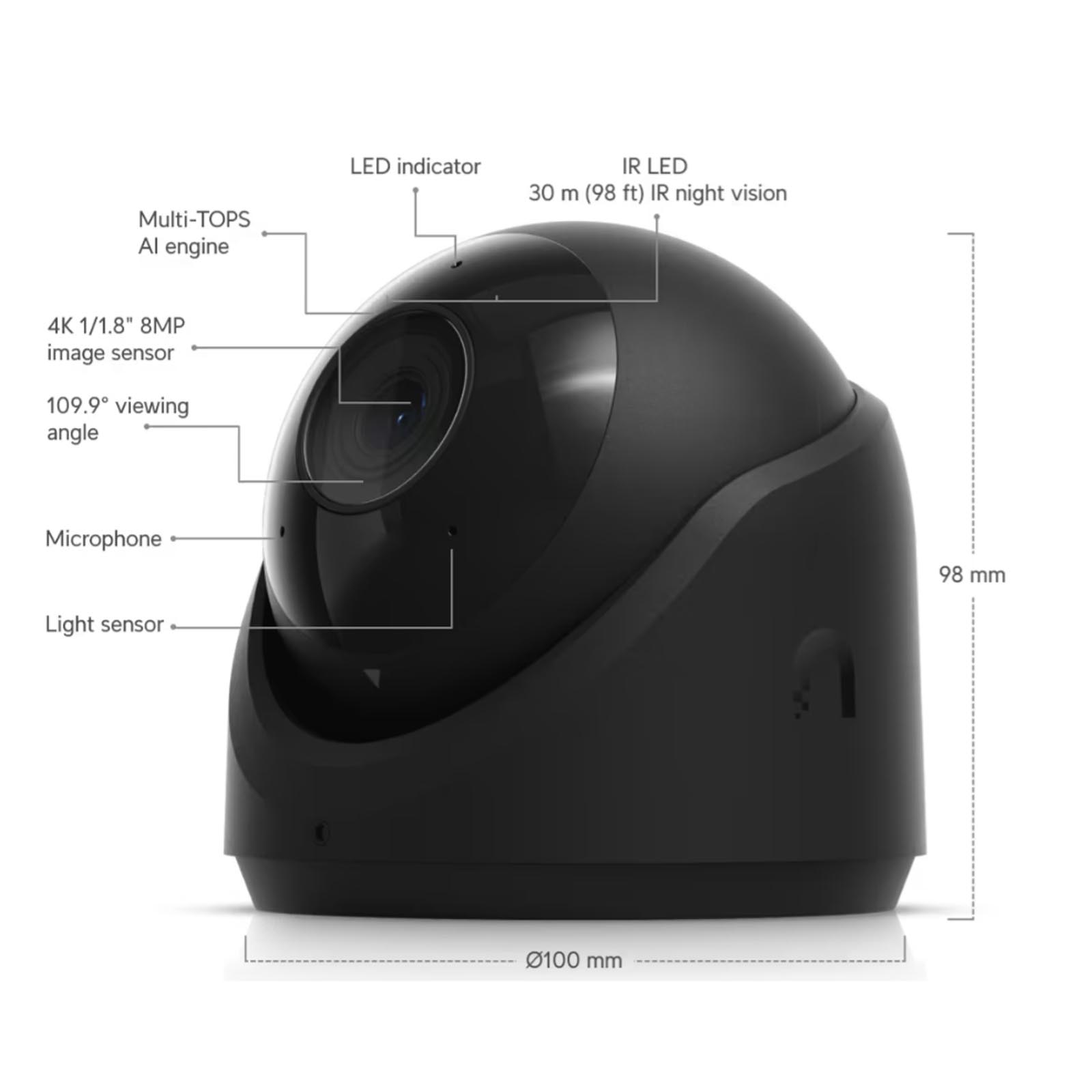 Kamera Ubiquiti UniFi G6 Turret jest wyposażona w matrycę o wysokiej rozdzielczości 4K 8 MP (3840 x 2160 przy 30 klatkach na sekundę) oraz stały obiektyw o polu widzenia 109,9°. Posiada diody LED na podczerwień zapewniające widoczność w nocy do 30 metrów, a także wbudowany mikrofon do nagrywania dźwięku. Urządzenie posiada port LAN 10/100 Mb/s z obsługą PoE i jest umieszczone w odpornej na warunki atmosferyczne obudowie o stopniu ochrony IP66, dzięki czemu idealnie nadaje się do użytku na zewnątrz.