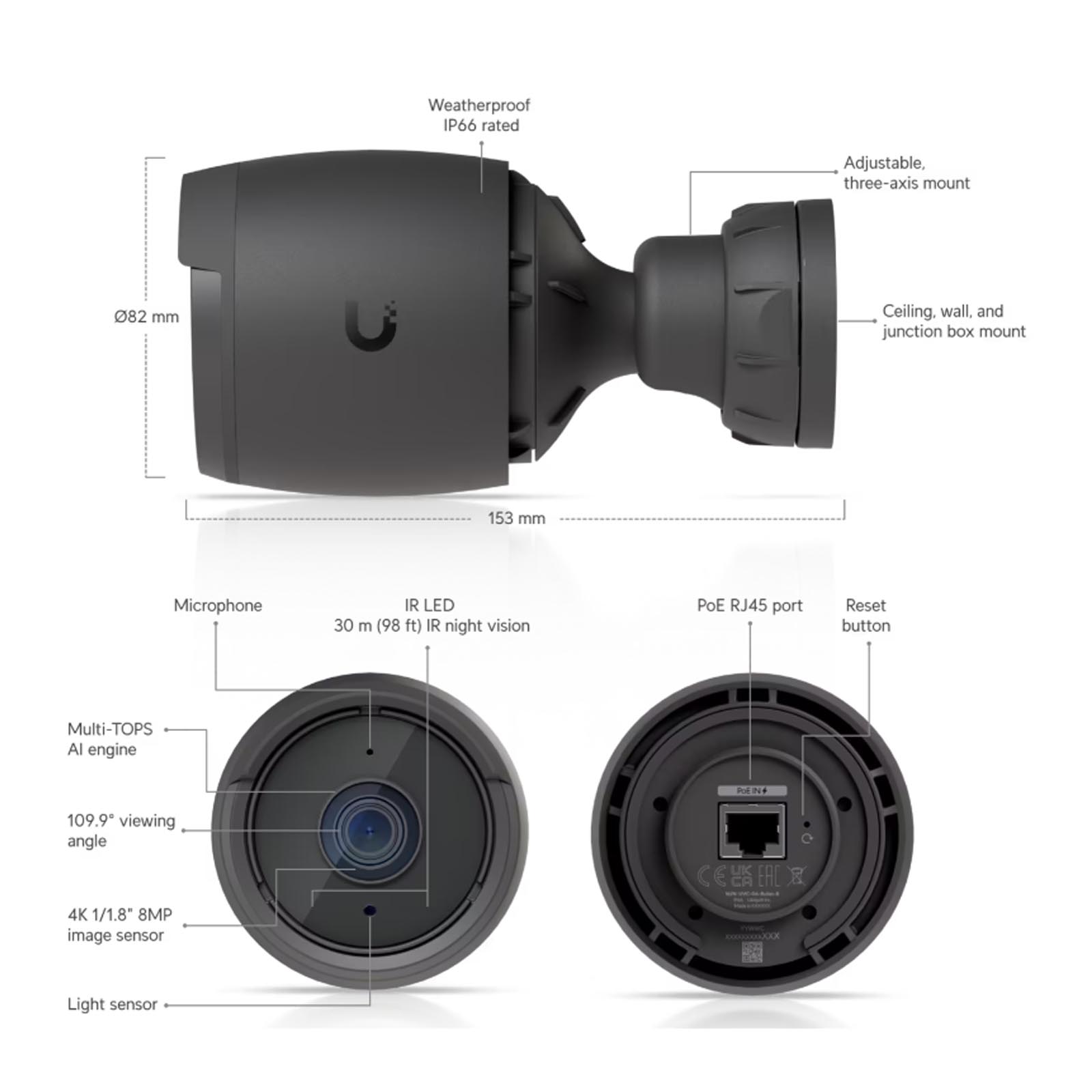 Kamera G6 Bullet płynnie integruje się z pakietem aplikacji UniFi Protect, oferując scentralizowane zarządzanie i monitorowanie w czasie rzeczywistym za pośrednictwem platform internetowych i mobilnych. Jest wyposażona w interfejs Ethernet 10/100 Mb/s do łączności sieciowej oraz wbudowany mikrofon do nagrywania dźwięku. Oprogramowanie sprzętowe kamery obsługuje zaawansowane funkcje, takie jak obrazowanie HDR i inteligentna analiza wykrywania, poprawiające świadomość sytuacyjną. Wykorzystując technologię AI, kamera G6 Bullet oferuje inteligentne funkcje wykrywania zdarzeń, w tym rozpoznawanie osób, pojazdów, zwierząt, twarzy i tablic rejestracyjnych. Zwiększa to bezpieczeństwo monitoringu, zapewniając dokładne i terminowe alerty. Zgodność z przepisami NDAA zapewnia przydatność do wdrożeń rządowych i korporacyjnych.