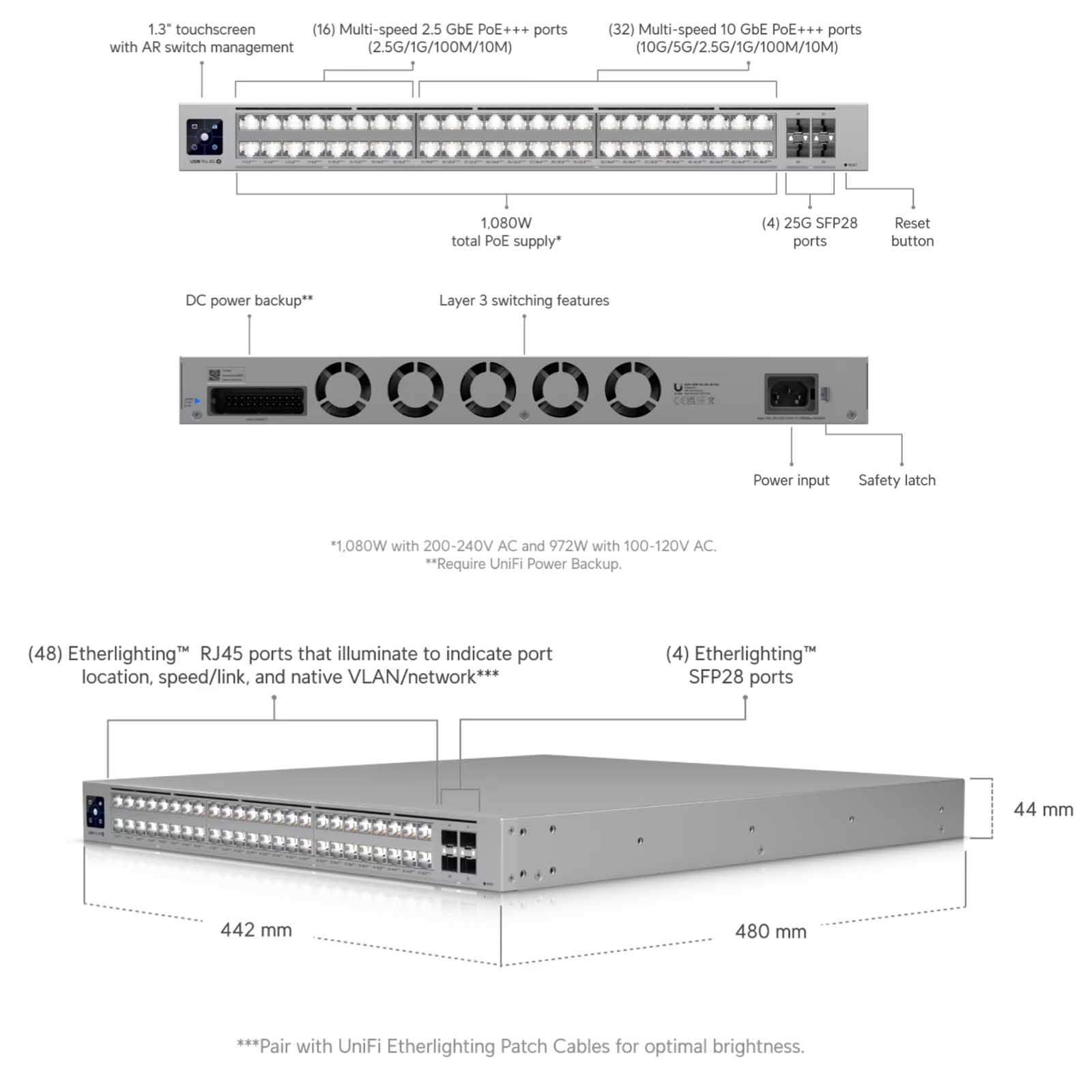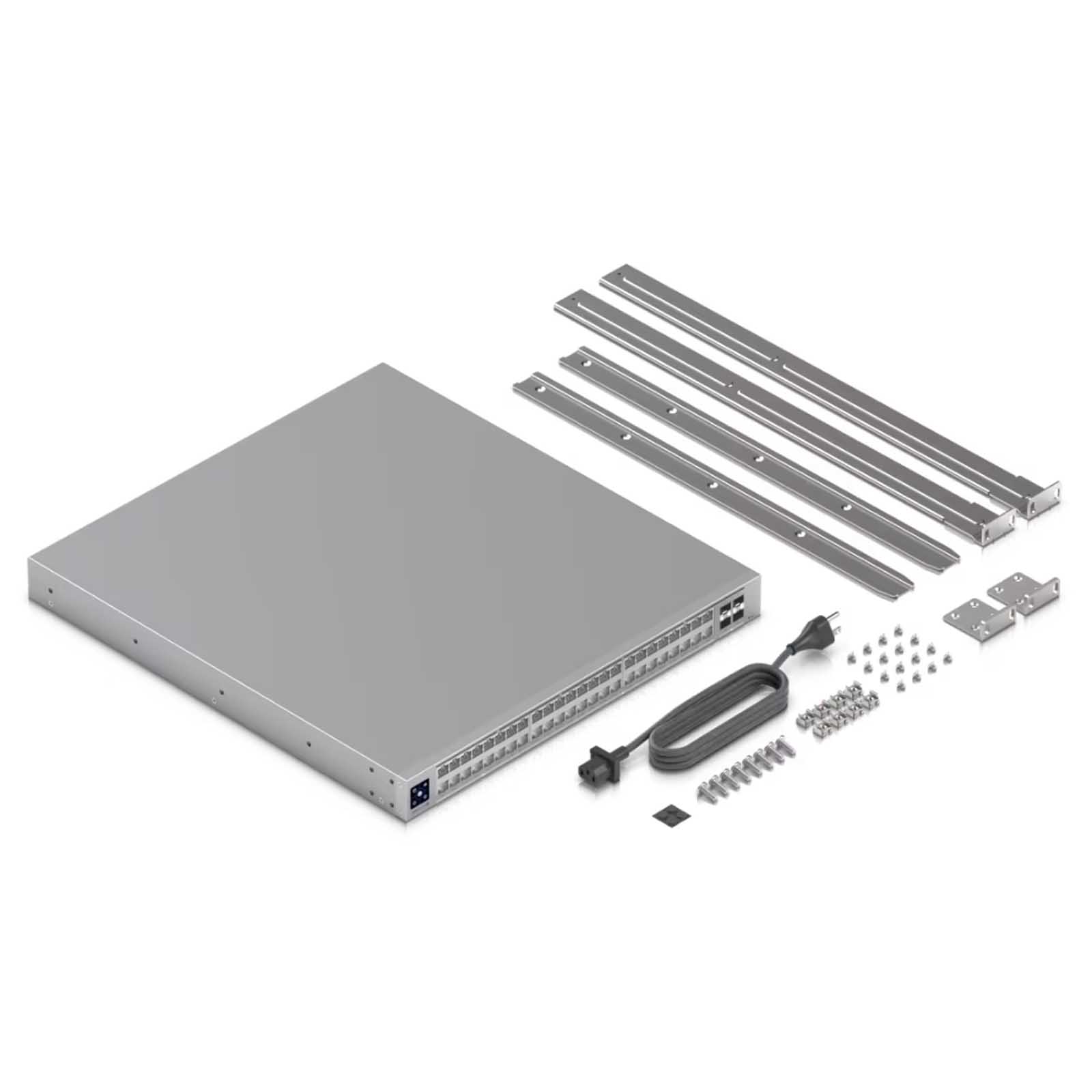 Ubiquiti UniFi Switch Pro XG 48 PoE (USW-Pro-XG-48-PoE) to profesjonalny 48-portowy przełącznik PoE+++ Etherlighting™ warstwy 3 z 32x portami 10G Gigabit Ethernet, 16x portami 2,5G Gigabit Ethernet i 4x slotami 25G SFP28. Ubiquiti UniFi Switch USW-Pro-XG-48-PoE to zarządzalny przełącznik L3 PoE o przepustowości 920 Gb/s, wyposażony w 16 portów LAN 2,5 Gigabit, 32 portów LAN 10 Gigabit oraz cztery porty SFP28 (25G/10G/1G). Wszystkie porty Ethernet obsługują PoE+++ 802.3af/at/bt PoE-Out z mocą wyjściową do 90 W/port i całkowitym budżetem PoE wynoszącym 1080 W. Porty są wyposażone w funkcję Etherlighting, która umożliwia podświetlenie portów kolorami w celu wskazania ich lokalizacji, prędkości/połączenia i sieci VLAN. Przełącznik jest zasilany napięciem 230 V AC, a port USP RPS DC dla systemu redundantnego zasilania UniFi SmartPower (USP-RPS), służy jako rezerwa na wypadek awarii zasilania głównego. Maksymalny pobór mocy wraz z PoE wynosi 1280 W. Niezrównana wydajność