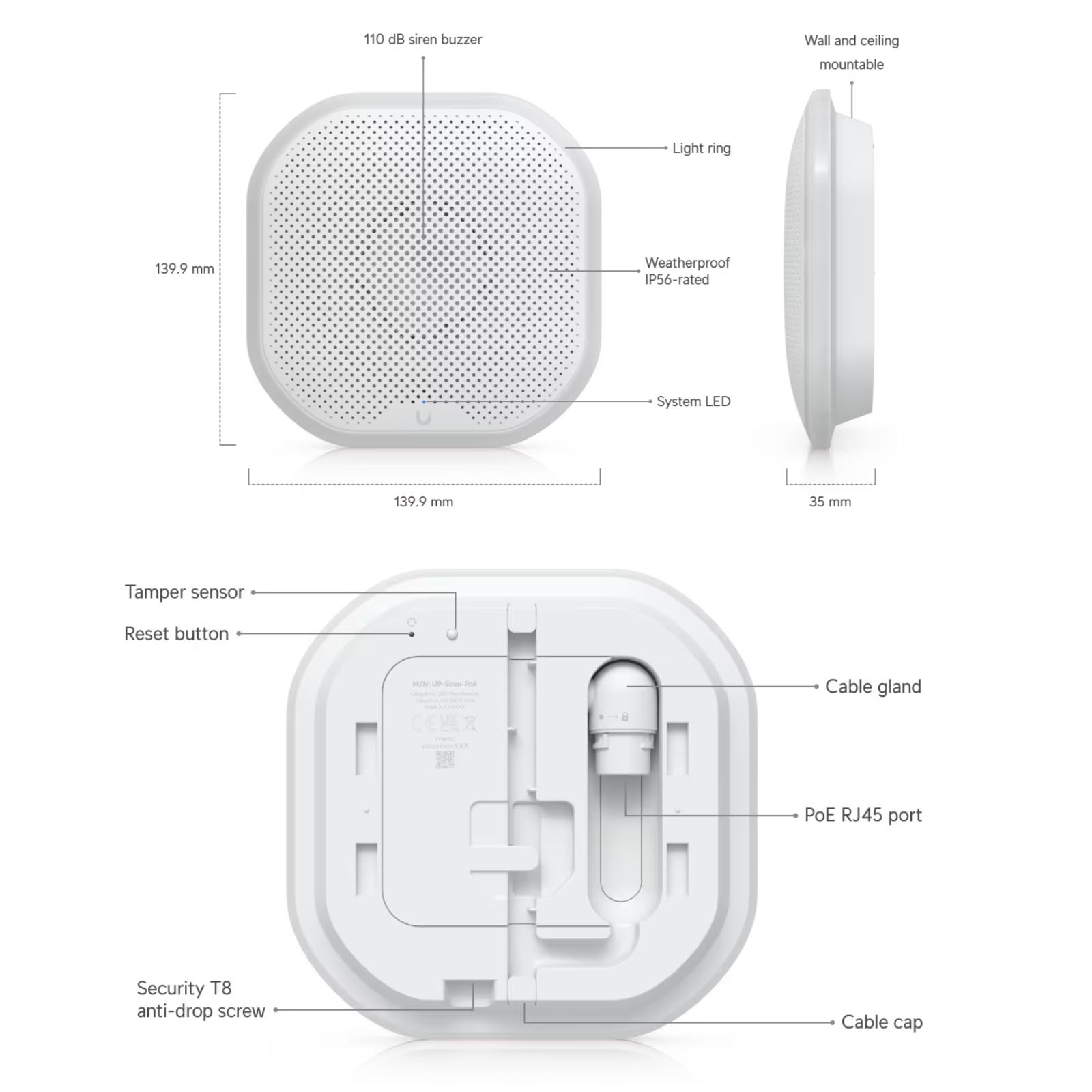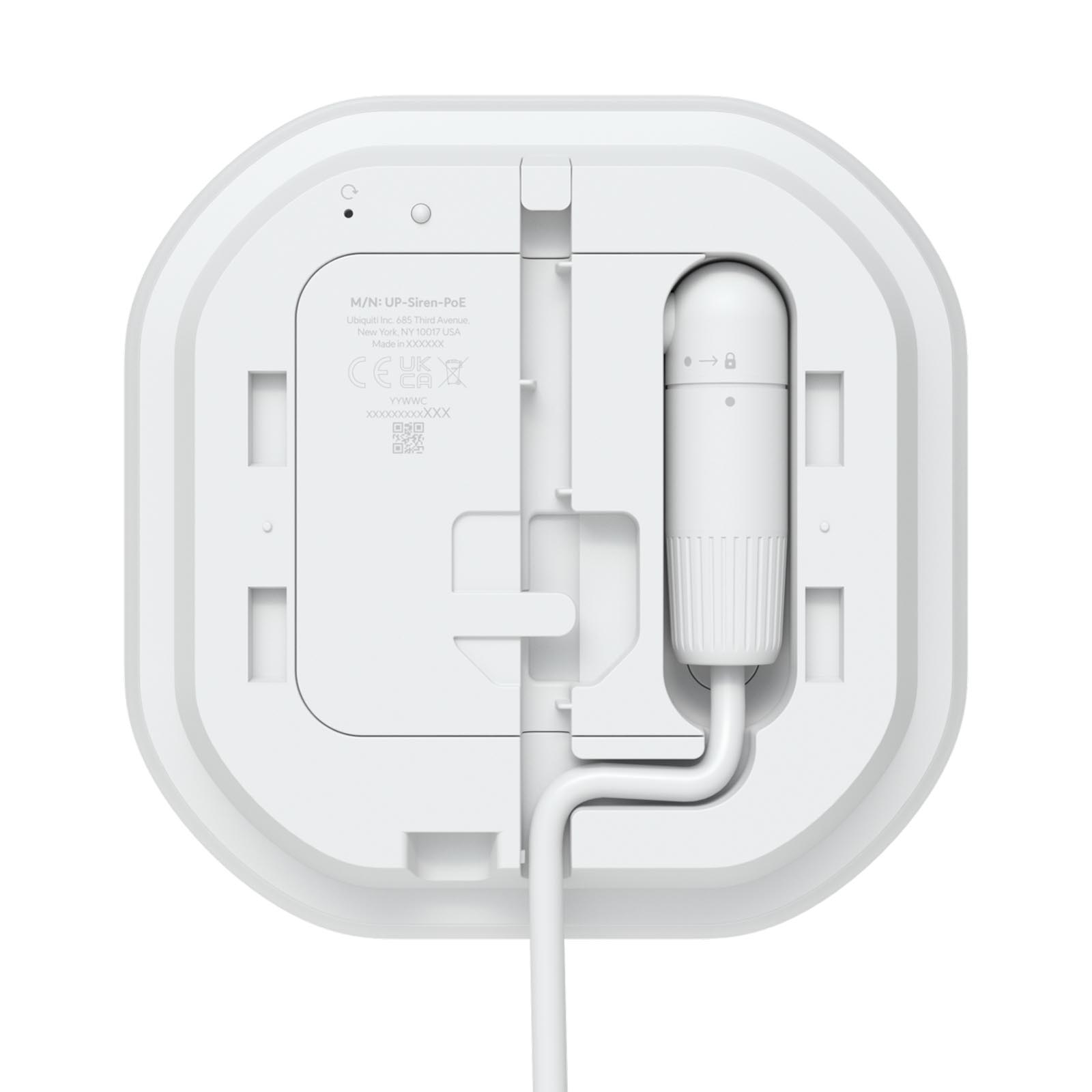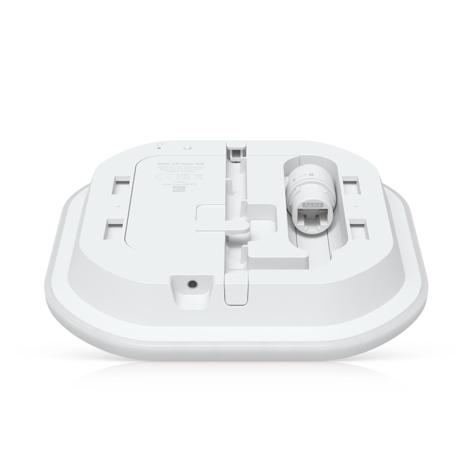 Ubiquiti Siren PoE (UP-Siren-PoE) to syrena pogodowa generująca alarm o natężeniu 110 dB i awaryjne oświetlenie LED zasilane przez wejście PoE. Ubiquiti UP-Siren-PoE to syrena akustyczna z alarmem o natężeniu 110 dB i sygnalizacją LED. Podłącza się ją za pomocą portu Ethernet 100 Mb/s, który służy również do zasilania poprzez PoE 802.3af. Maksymalny pobór mocy syreny wynosi 5 W. Stopień ochrony IP56. Nadaje się do montażu zarówno wewnątrz, jak i na zewnątrz budynków, na ścianie lub suficie. Wydajny system alarmowy