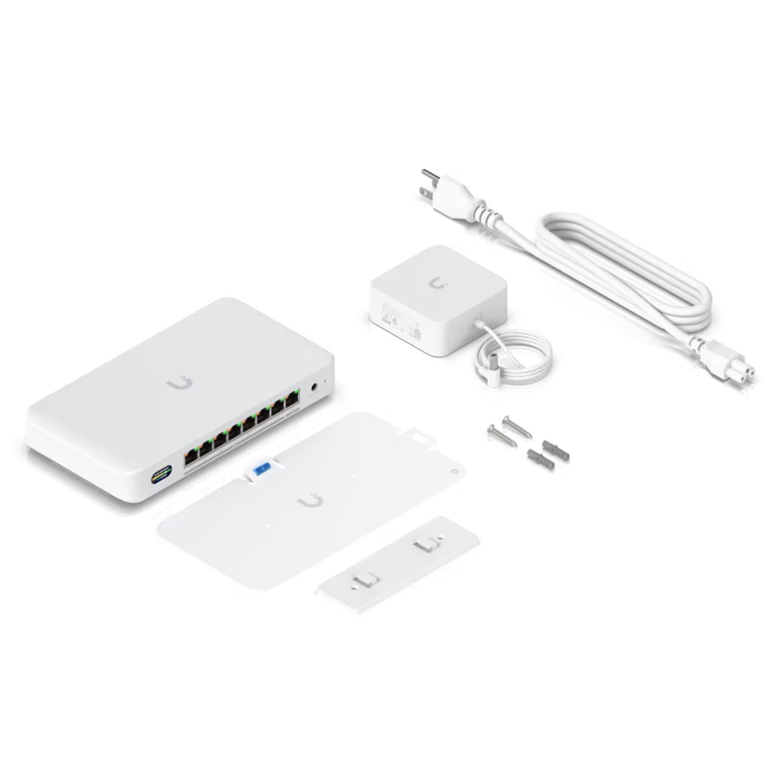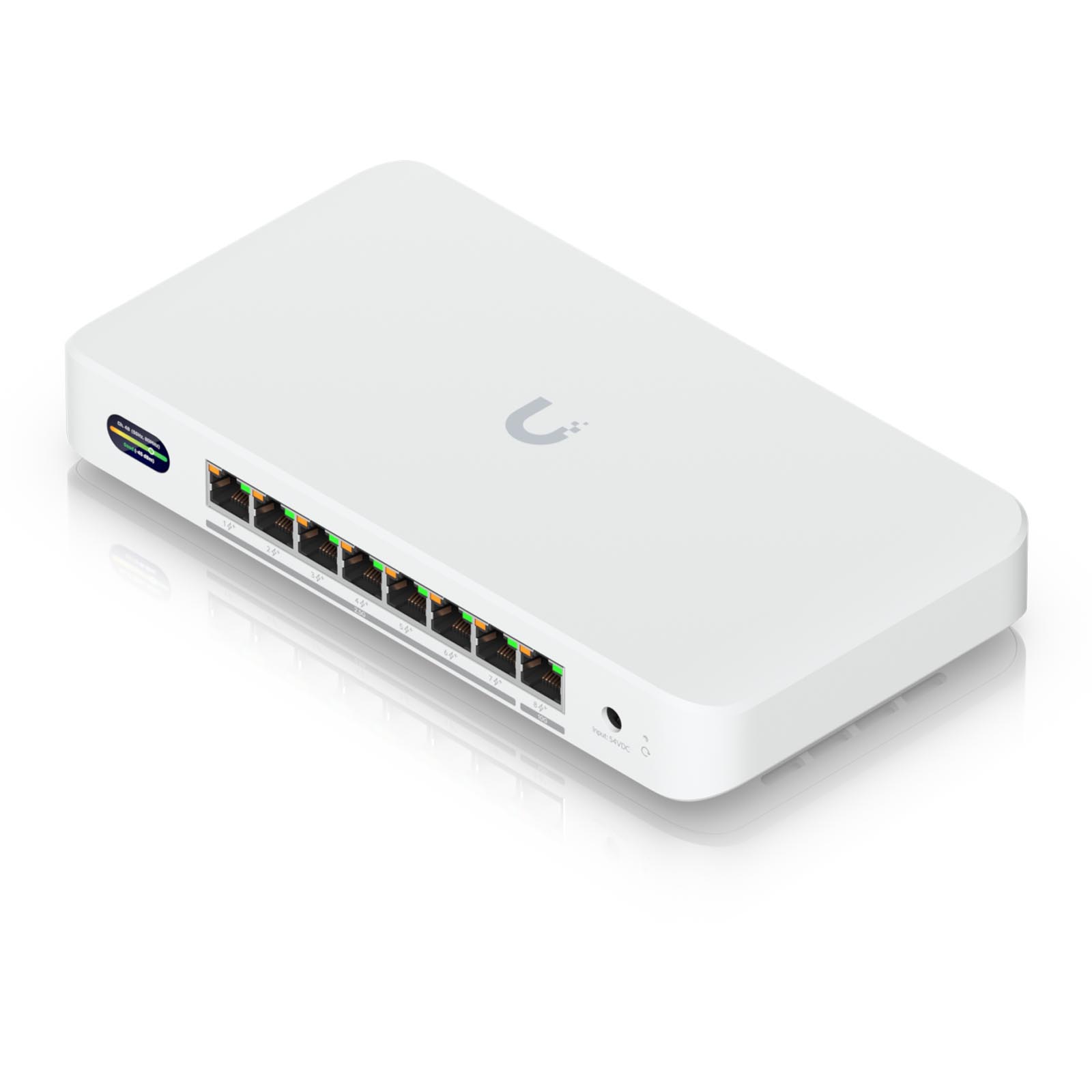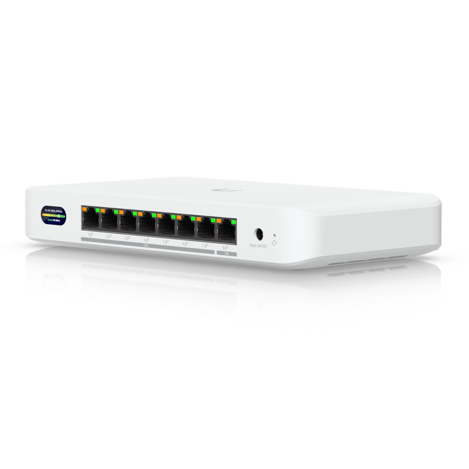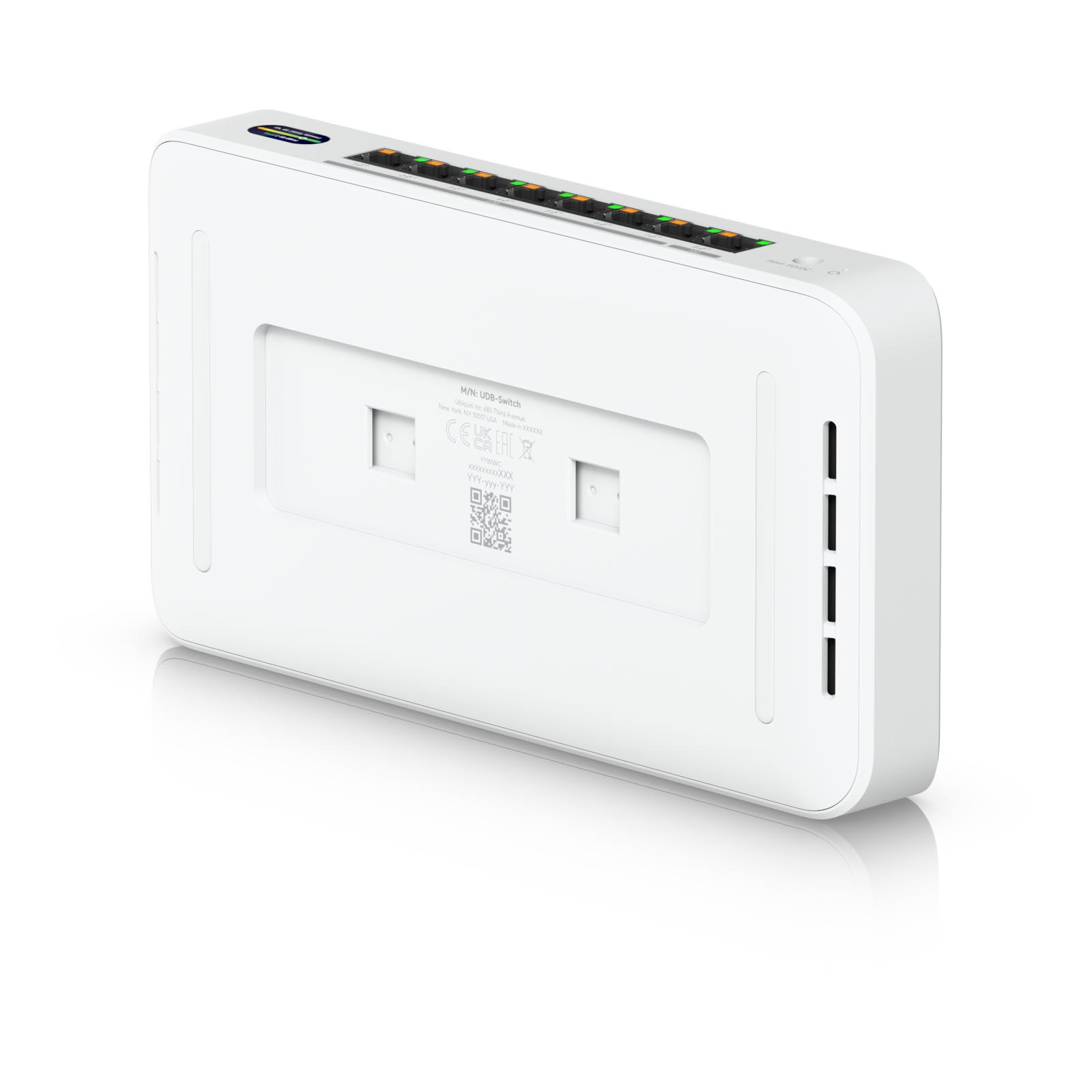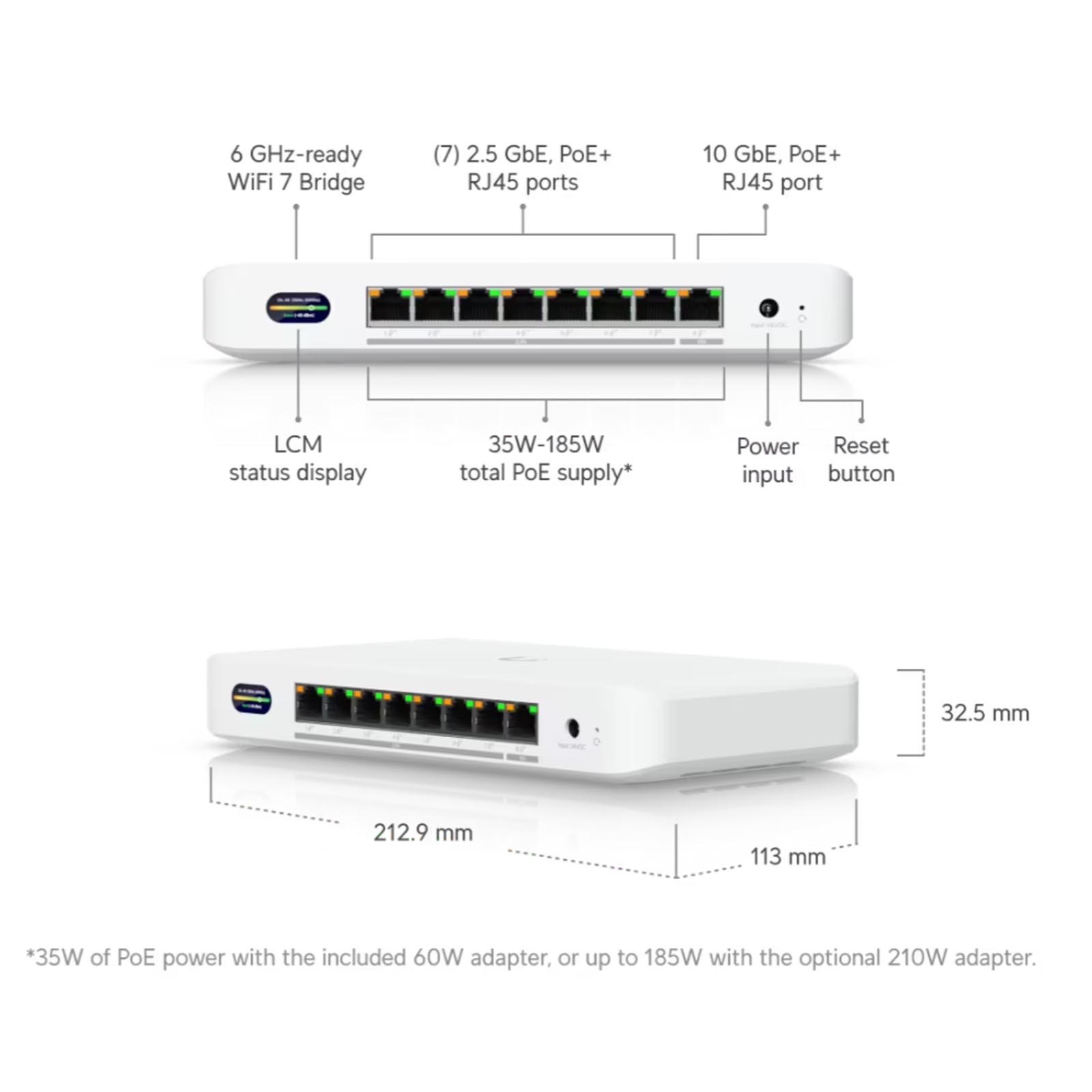 Ubiquiti UniFi Device Bridge Switch (UDB-Switch) to kompaktowy przełącznik PoE+ z 1x portem 10G Gigabit Ethernet, 7x portami 2.5G Gigabit Ethernet i budżetem PoE do 185 W oraz integracją mostkowania WiFi 7 obsługującego pasmo 6 GHz, zapewniający płynne, bezprzewodowe połączenie uplink o dużej przepustowości z siecią UniFi WiFi. Maksymalny pobór mocy urządzenia wynosi 25 W (bez obciążenia PoE).