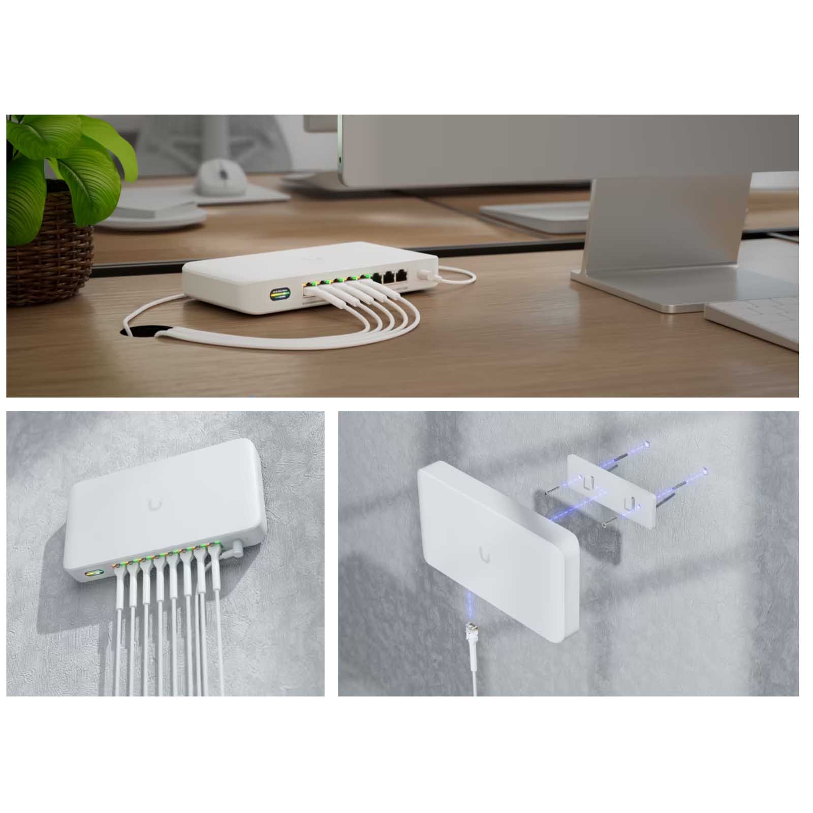 Przełącznik UDB-Switch został zaprojektowany w celu uproszczenia wdrożeń poprzez połączenie funkcji przełączania, mostkowania bezprzewodowego i zasilania w jednym kompaktowym urządzeniu. Wszystkie osiem portów Ethernet obsługuje technologię PoE+, zapewniając do 30 W na port do zasilania punktów dostępowych UniFi, kamer IP i innych urządzeń obsługujących technologię PoE. Dzięki dołączonemu zasilaczowi o mocy 60 W przełącznik oferuje łączną moc PoE wynoszącą 35 W, co idealnie sprawdza się w przypadku mniejszych instalacji. W przypadku bardziej wymagających środowisk opcjonalny zasilacz 210 W zwiększa całkowitą dostępność PoE do imponujących 185 W, obsługując jednocześnie wiele urządzeń o dużej mocy. Sam przełącznik zużywa do 25 W bez wyjścia PoE, zapewniając wydajną pracę. Przełącznik UDB-Switch, zaprojektowany do montażu na biurku lub ścianie, z łatwością mieści się w biurach, sklepach, magazynach lub zdalnych węzłach sieciowych. Ta skalowalność pozwala na użycie tego samego urządzenia w małych konfiguracjach dzisiaj i rozbudowę w przyszłości, wraz ze wzrostem wymagań sieciowych.