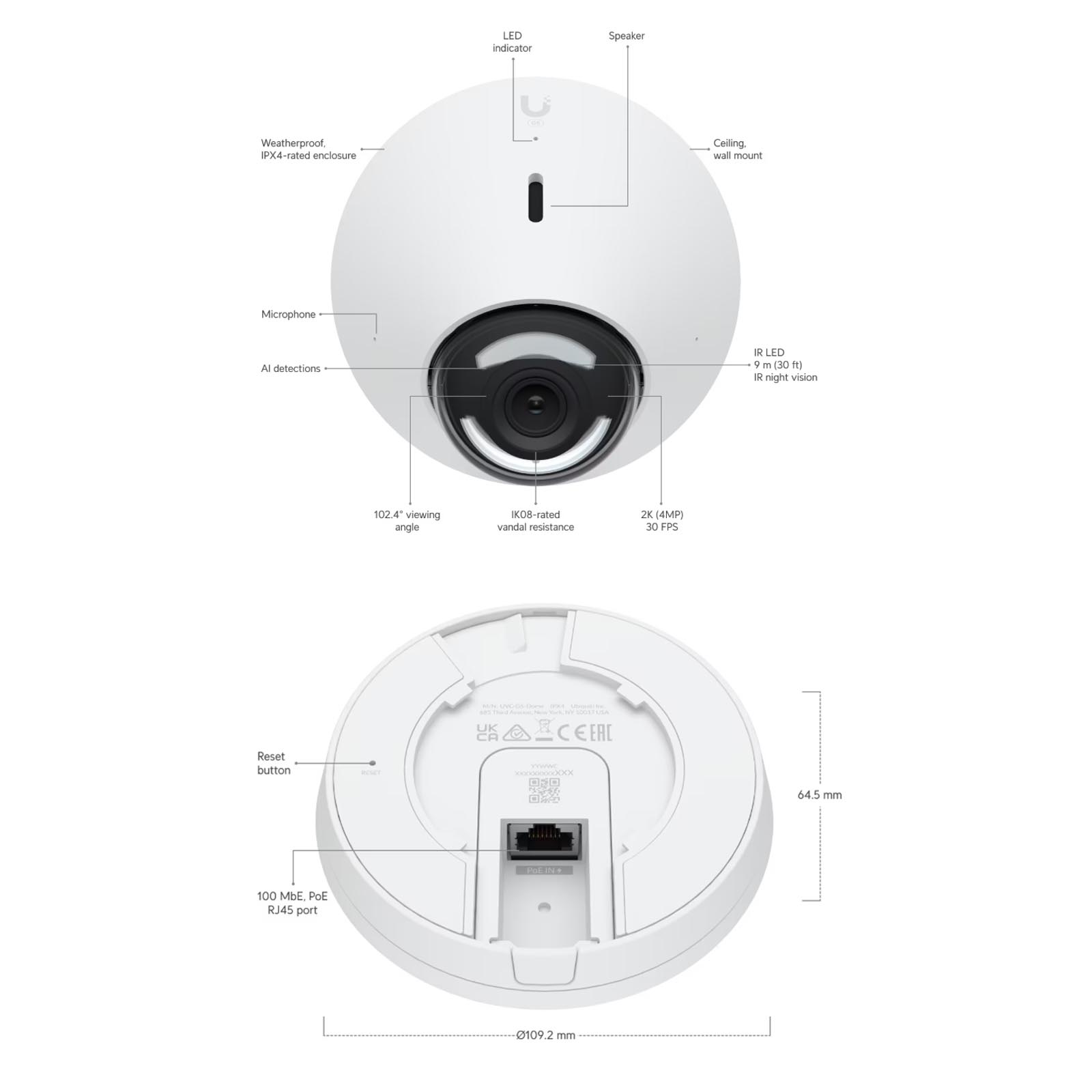 UniFi Video Camera G5 Dome zapewnia wyraźne wideo 4MP, 30 fps przez port Fast Ethernet. Konstrukcja umożliwia instalację na suficie w wewnątrz lub na zewnątrz i zapewnia szeroki kąt widzenia, który wynosi 71,4° w pionie i 102,4° w poziomie (przekątna 134,3°). Kamera wyróżnia się szerokim kątem nagrywania, znacznie większym niż w przypadku kamer z obiektywami 3,6 / 4 mm. Kamera jest wyposażona w diody LED na podczerwień z automatycznym filtrem odcinającym IR do monitorowania w dzień i w nocy.Kamera posiada diody IR i wspiera czarnobiały tryb nocny, w którym maksymalny zasięg wynosi 9 m. Dodatkowym atutem jest światłoczuły obiektyw - jakość nagrań przy słabym oświetleniu jest znacznie lepsza niż w konkurencyjnych rozwiązań.