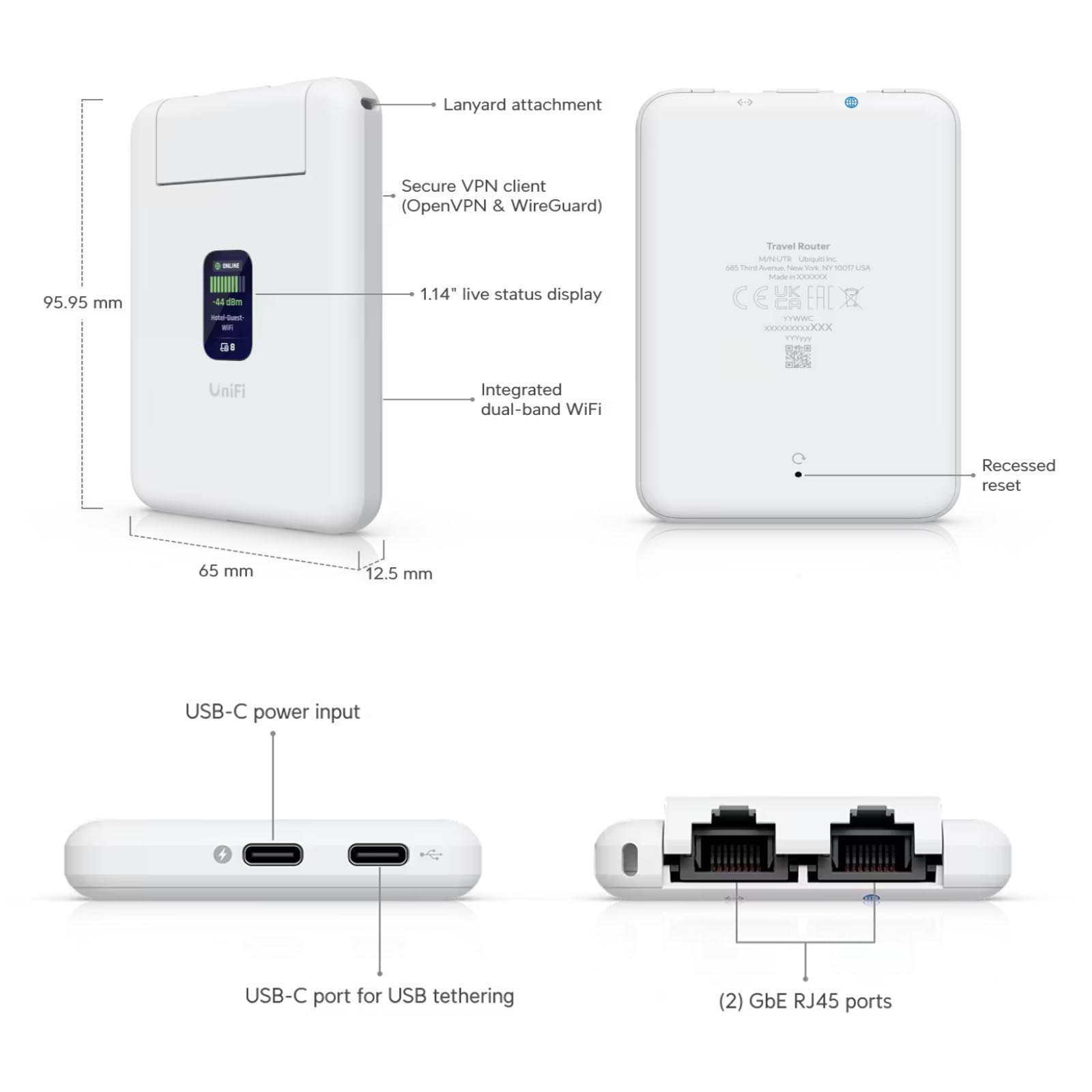 Ubiquiti UniFi Travel Router (UTR) to ultrasmukły router podróżny, który błyskawicznie rozszerzy Twoją sieć UniFi, gdziekolwiek jesteś, zapewniając bezpieczną, znaną łączność w odległych lokalizacjach. Router podróżny Ubiquiti UniFi UTR to ultrakompaktowy, dwupasmowy router podróżny Wi-Fi 5, działający jednocześnie w pasmach 2,4 GHz i 5 GHz, zapewniając maksymalną przepustowość do 1,17 Gb/s. Wyposażony jest w 2x porty Gigabit Ethernet i intuicyjny wyświetlacz. Router umożliwia udostępnianie danych mobilnych ze smartfona lub przekształcanie publicznej sieci Wi-Fi w sieć prywatną. Dzięki funkcji Teleport można łatwo utworzyć bezpieczny tunel VPN do swojej sieci UniFi z dowolnego miejsca. Przenośny router podróżny