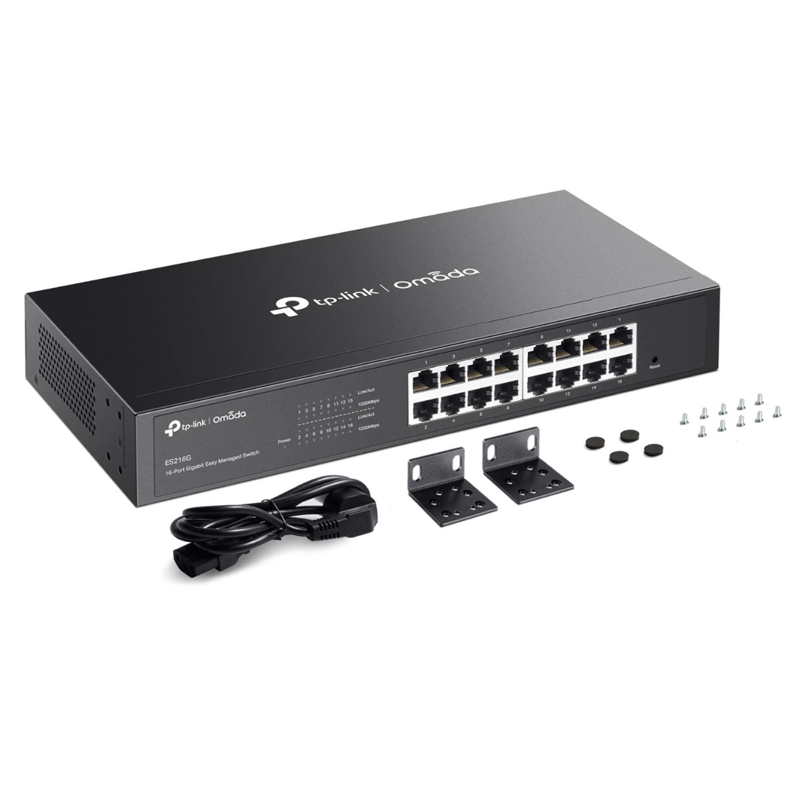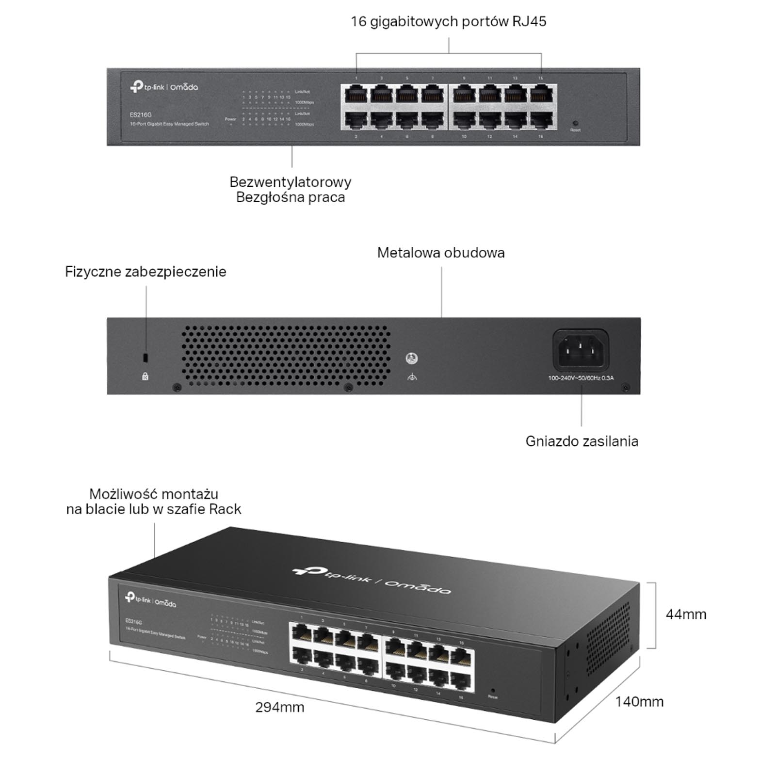 TP-Link ES216G to zarządzalny przełącznik Omada Easy Managed, wyposażony w 16x portów Gigabit Ethernet 10/100/1000 Mb/s. Wszystkie porty obsługują automatyczną negocjację szybkości połączeń i automatyczne krosowanie Auto MDI/MDIX. Wydajnośc przełączania wynosi 32 Gb/s.