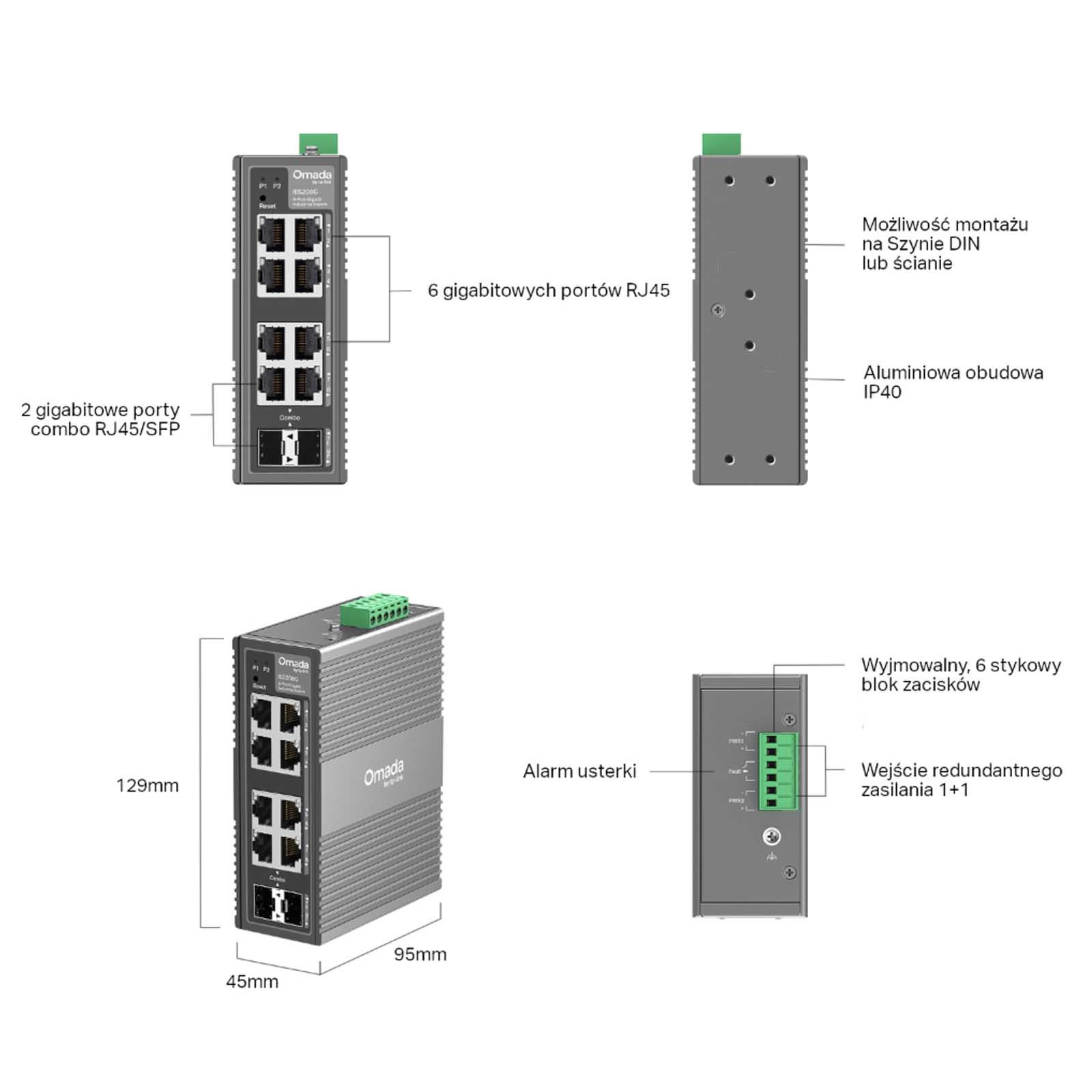 TP-Link IES208G to przemysłowy przełącznik Industrial Easy Managed Omada, wyposażony w 8x portów gigabitowych. Switch TP-Link IES208G to najbardziej kompaktowy przełącznik w serii Omada Industrial, oferujący 8x gigabitowych portów (6x RJ45, 2x Combo RJ45/SFP). Podobnie jak pozostałe modele, działa w szerokim zakresie temperatur i charakteryzuje się pełną odpornością na kurz i przepięcia. To rozwiązanie dla mniejszych instalacji przemysłowych, gdzie kluczowe są niezawodność i łatwość zarządzania. Ochrona klasy przemysłowej stworzona do trudnych warunków